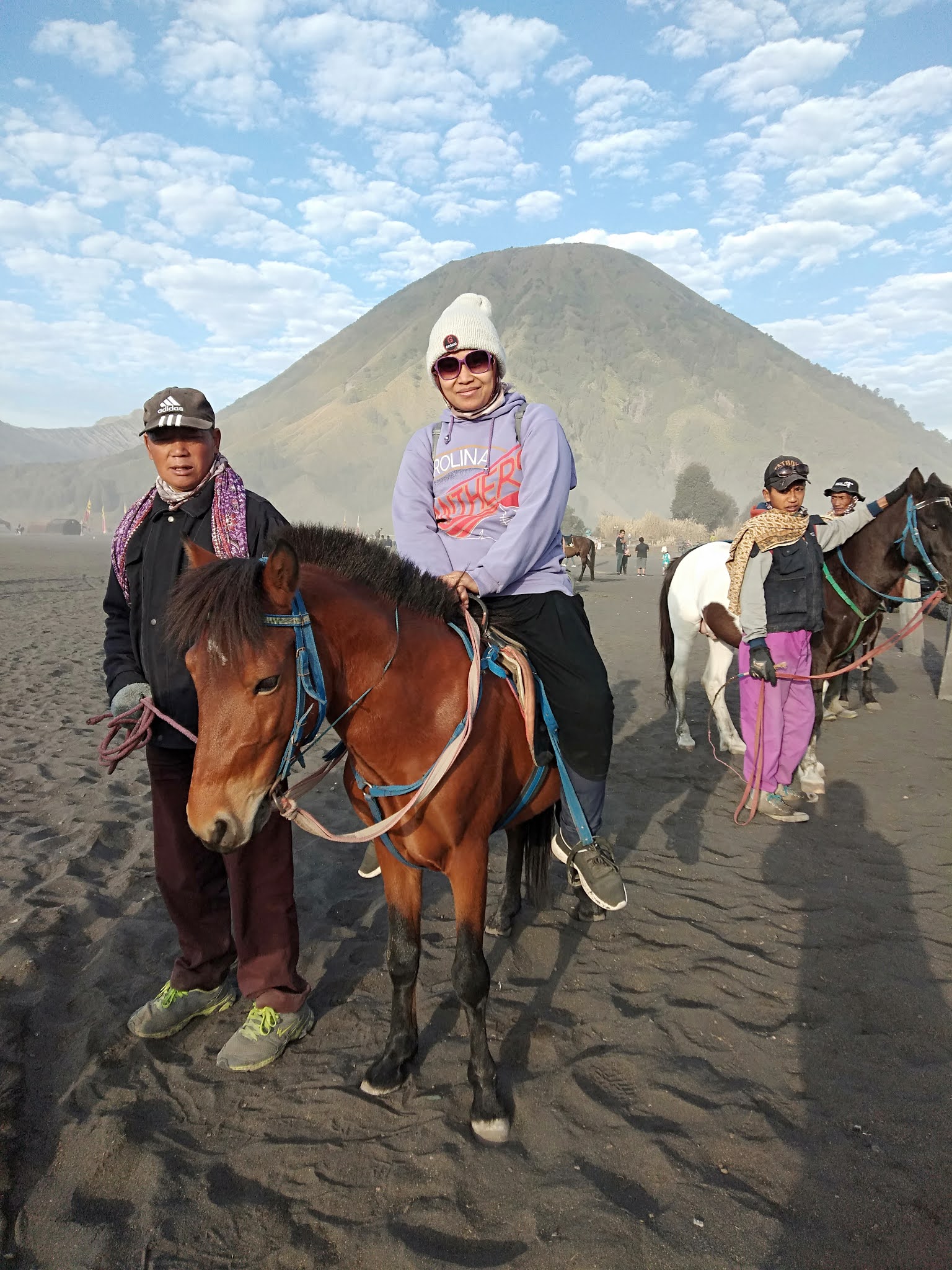 Menjelang terang, mulai berdatangan bapak-bapak yang menyewakan kuda, seumur hidup baru kali ini naik kuda beneran. Badannya goyang-goyang serasa mau jatuh. Tegang banget di atas punggung kuda. Hihihi.. norak-norak bergembira pokoknya. :p